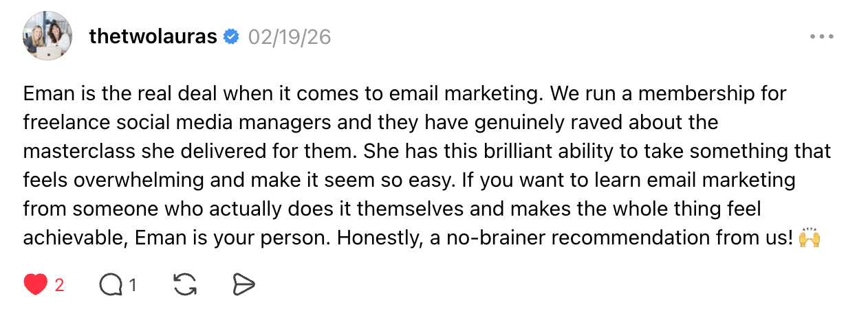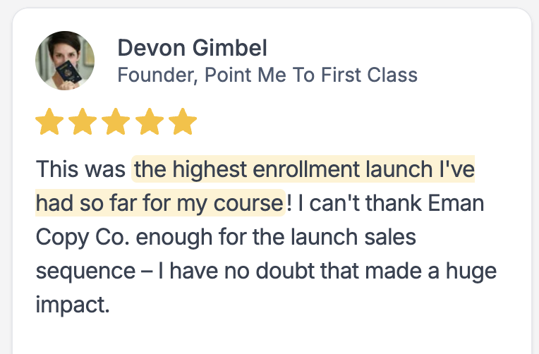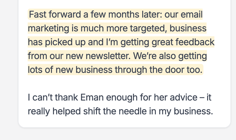 Drop in your emails for copy review, ask strategy questions, get clarity checks, and receive direct feedback from me.